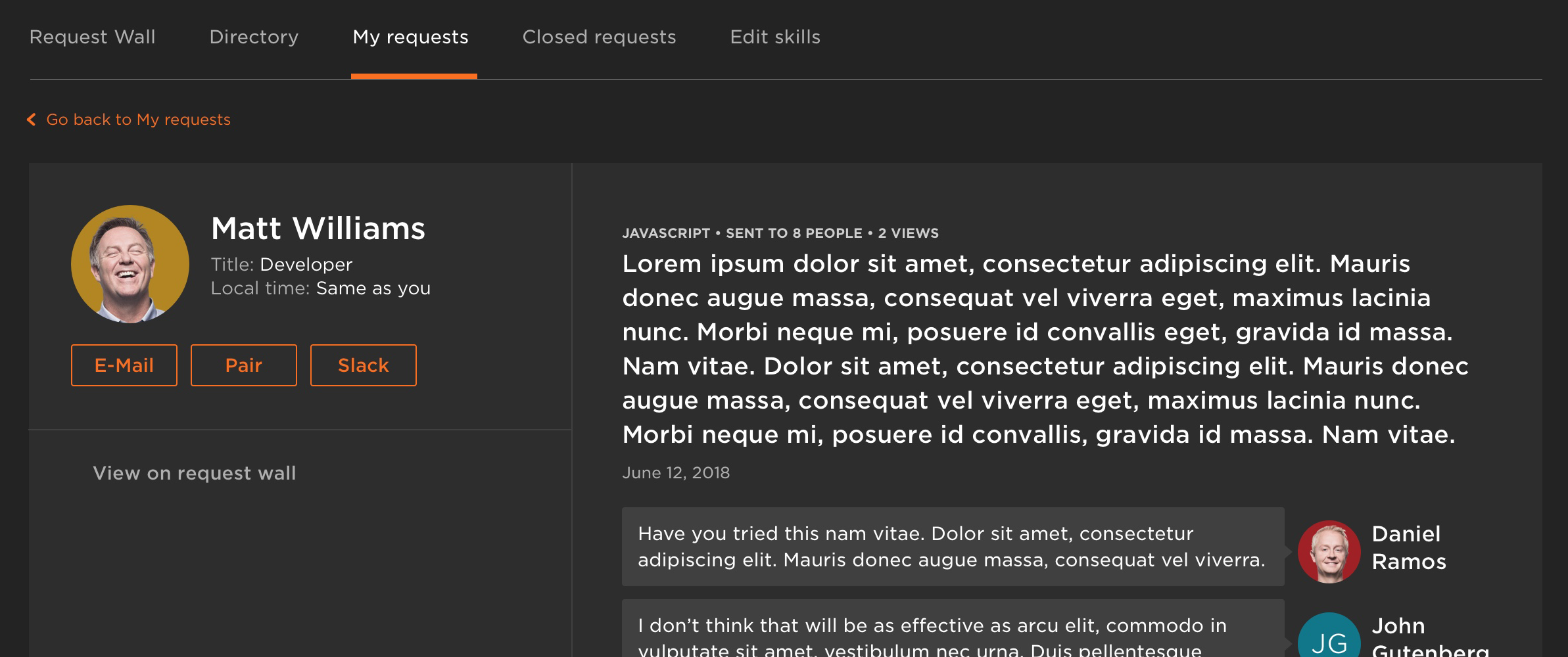 Post release research indicated a desire to tag other people within the user’s organization to alert them of the question or answer. Right before leaving the team, I designed a mention system that would be triggered by the “@“ character. The list would be filtered according to what the user wrote next. If the user pressed the space bar after the “@“ character the list would then disappear.