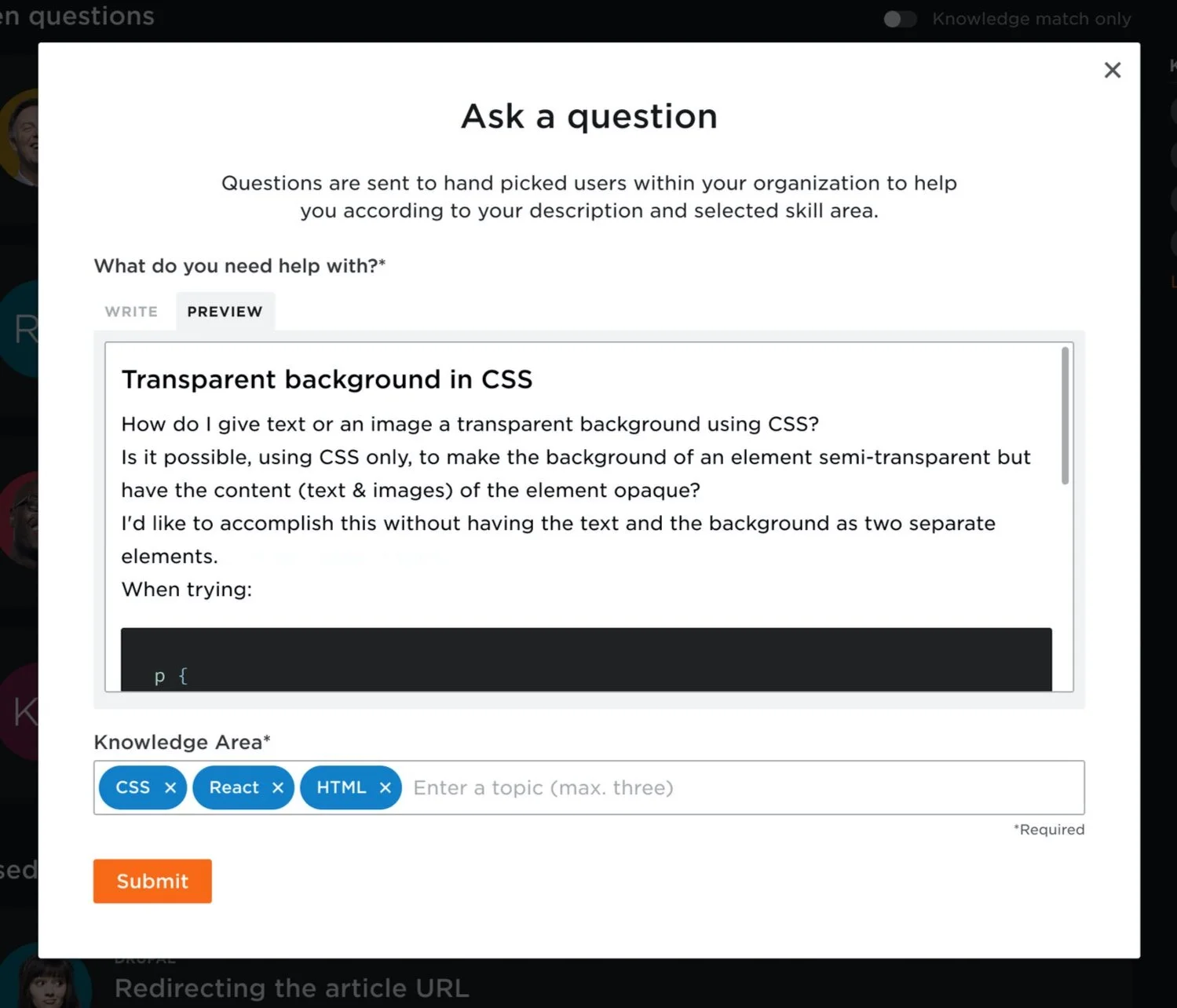 The key factor in growing our community is the ability to ask a question. Every user of Pluralsight is prompted to share their knowledge and interests with us. When those topics are selected in asking a question, we send the question directly to those experts within their organization.