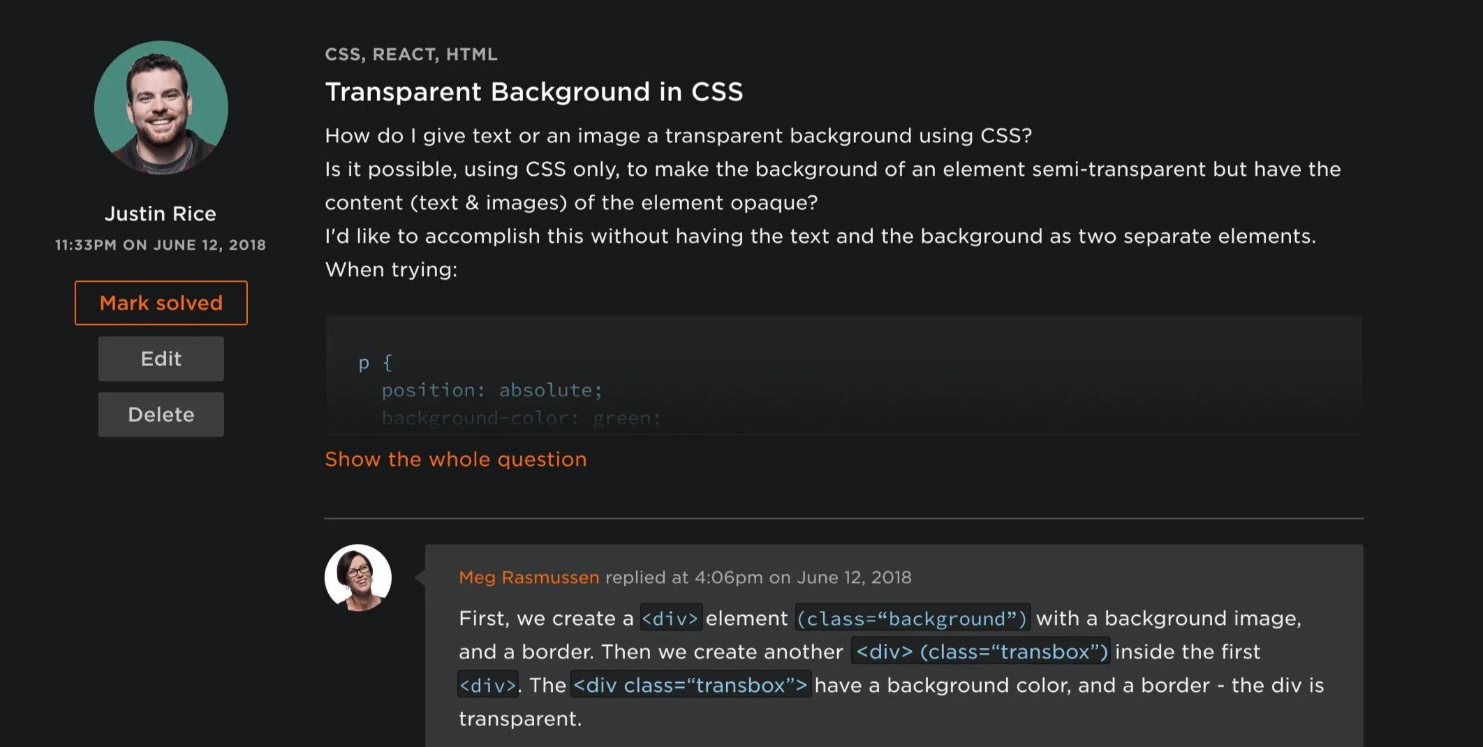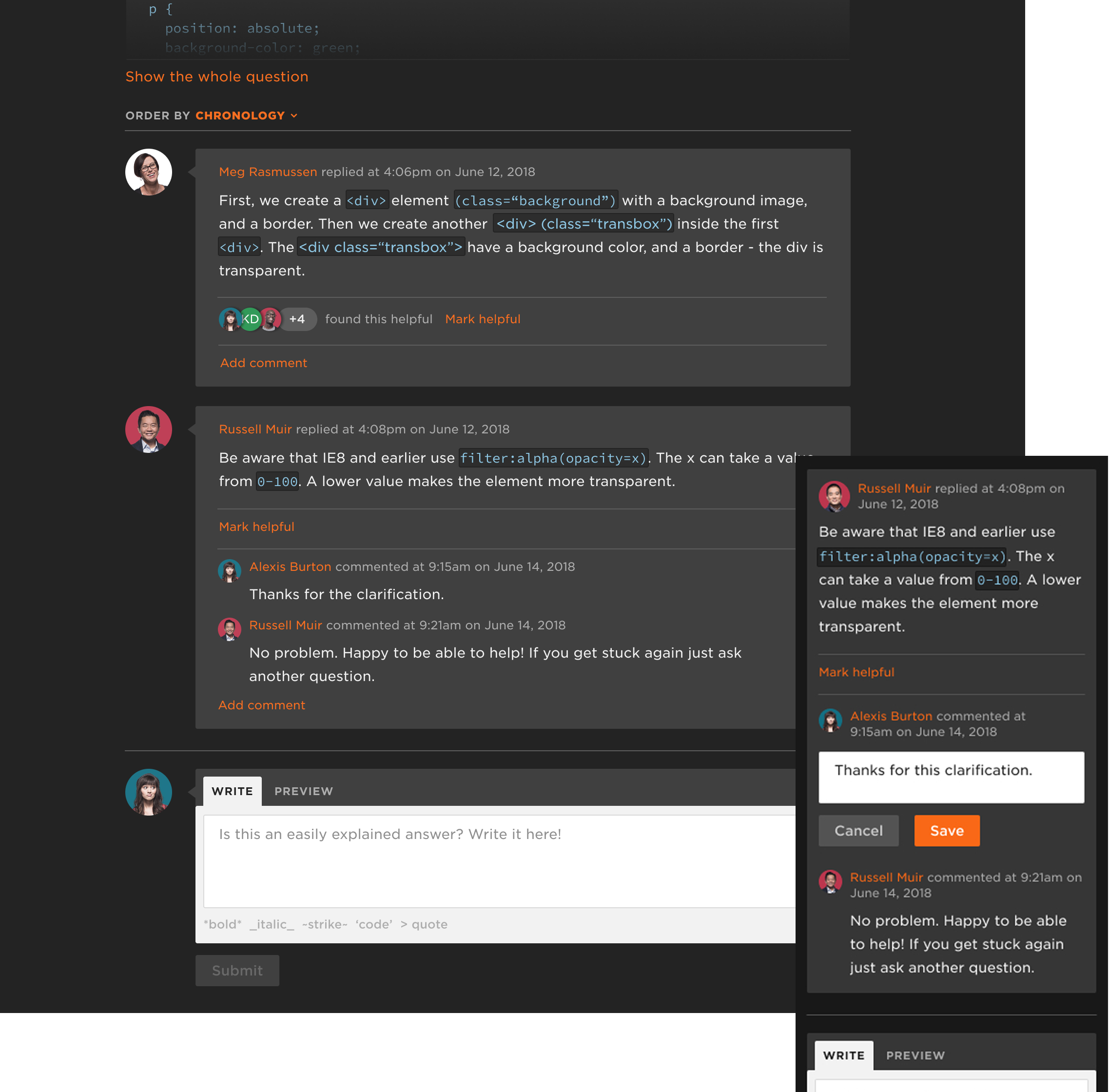 As a way to focus our user’s attention to the question and also to match the styling of the answers and comments, I moved the asker’s question information to the top of the question.
