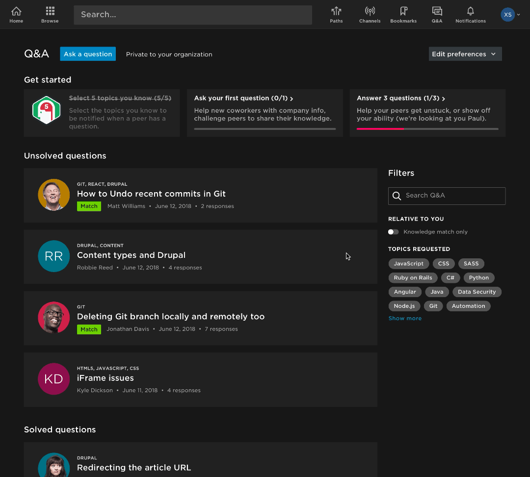 We built an internal tool, Q&A, where our learners can ask and answer questions specific to projects they work on. Q&A then delivers those questions to the right people within their organization, who have the skills to answer.