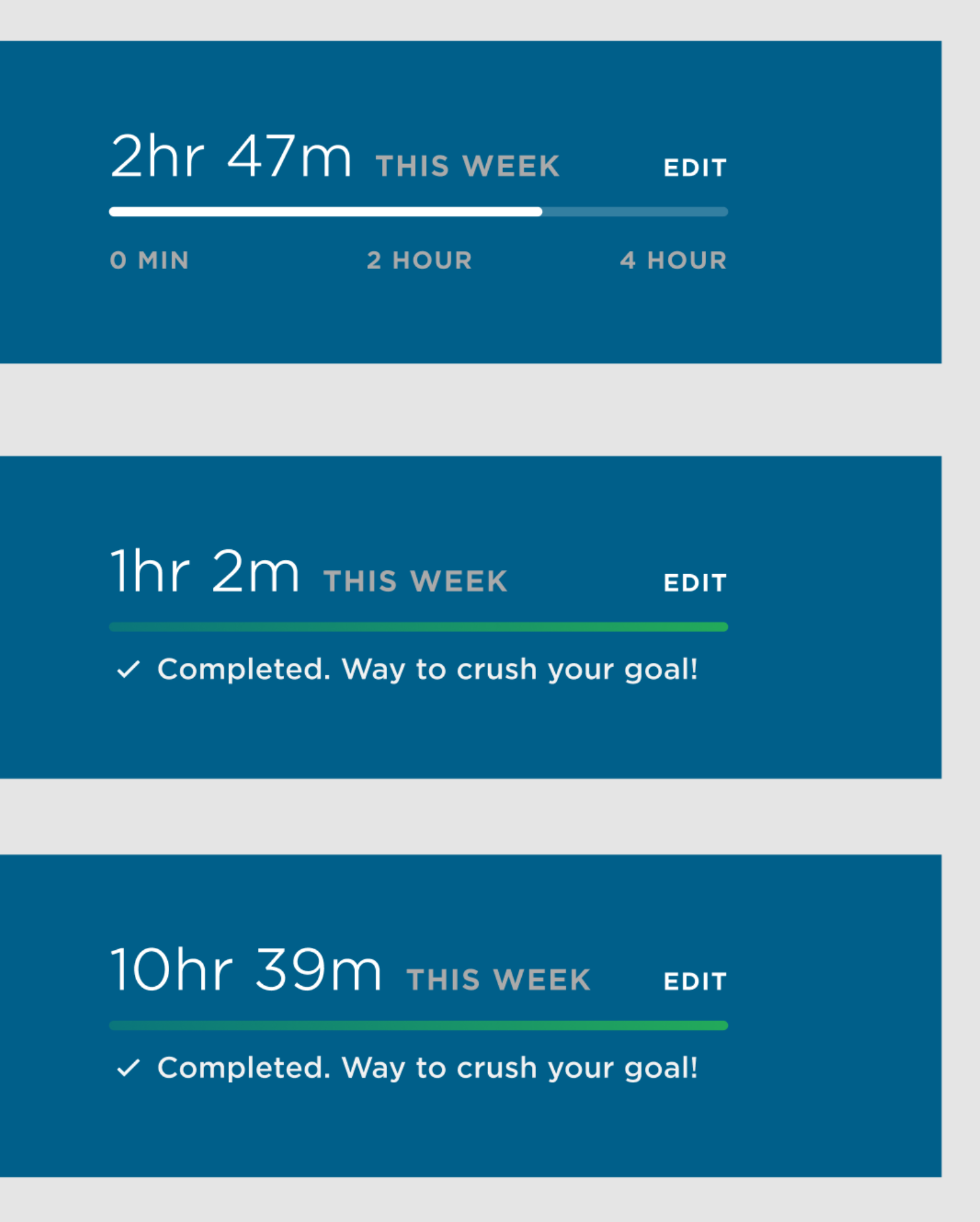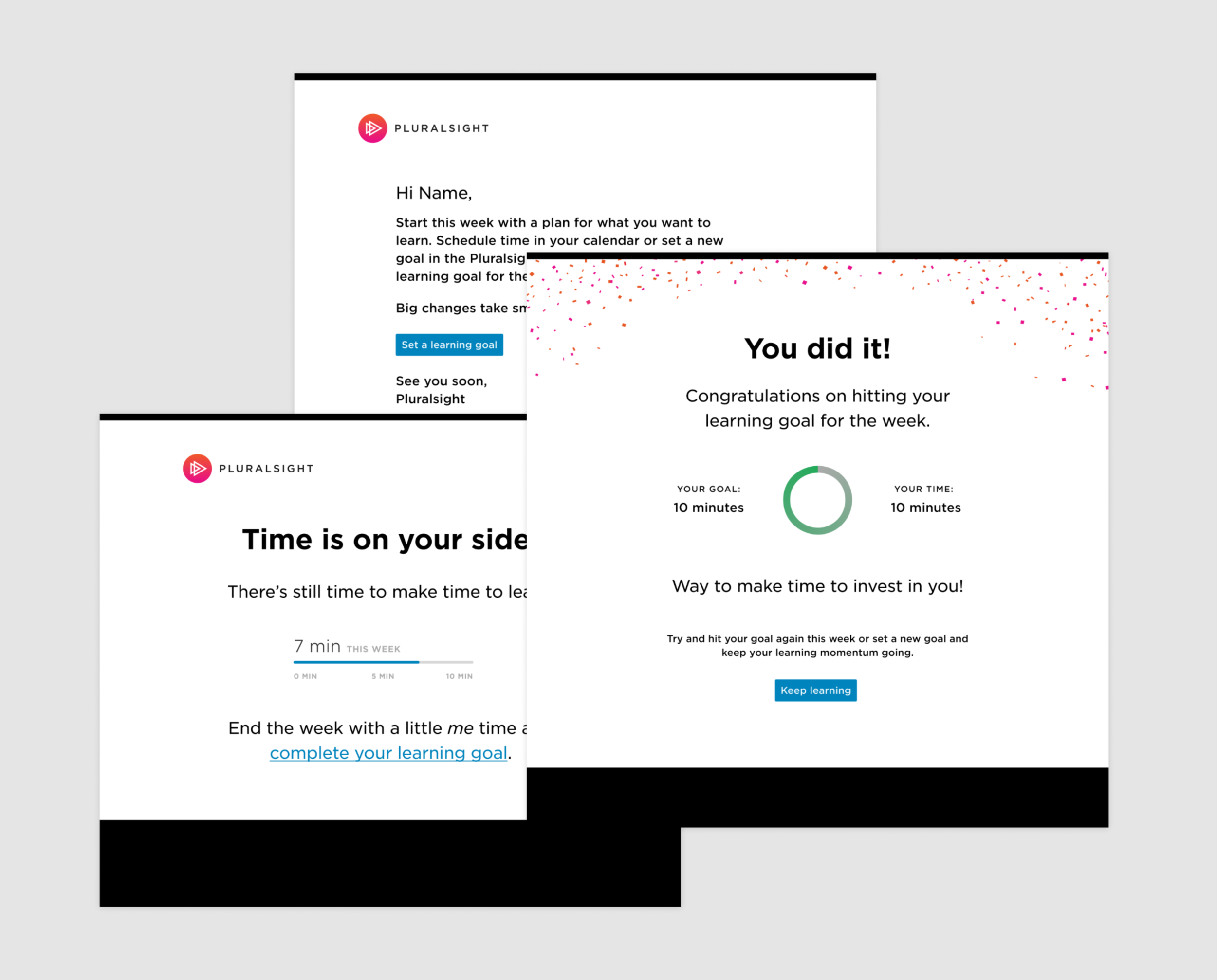 We created a widget on Pluralsight’s home page that collects the users’ time-based goal. By email we remind the learner of their goal throughout the week and celebrate their success.